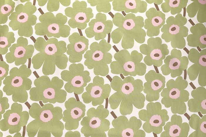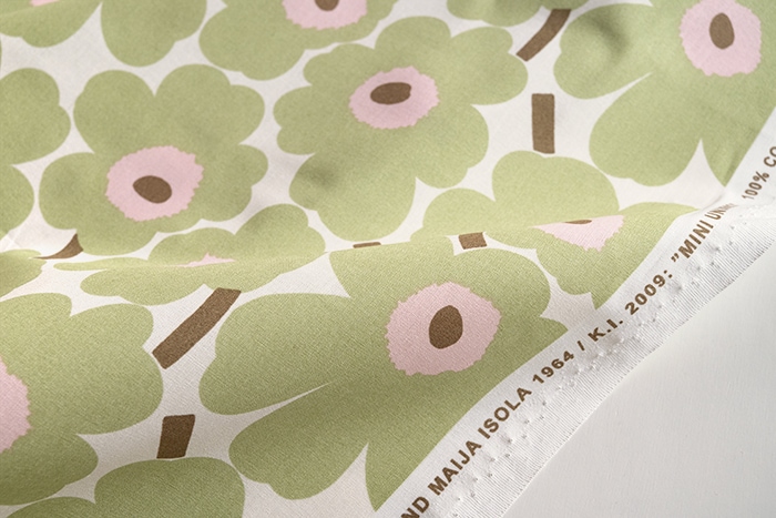 マリメッコの定番柄、小さなケシの花と言う意味のミニウニッコ。 オフホワイト×イエローグリーン×ピンクのカラーリングは、日本別注の限定色。数量限定入荷です。 10cm単位はかり売りの場合は、“数量5で50cm”、“数量10で1m”となります。 お好きな長さでお買い求めください。 お試しハーフカットは約73×50cmのカットクロス。生地感の確認や小物づくりにおすすめです。